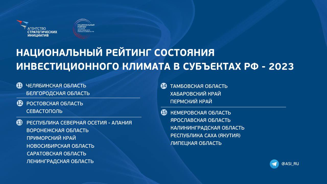 Ранее на площадке Международного экономического форума результаты ежегодного национального рейтинга состояния инвестиционного климата в субъектах РФ представила генеральный директор Агентства стратегических инициатив Светлана Чупшева. Рейтинг ежегодно формируется агентством вместе с ведущими деловыми объединениями.