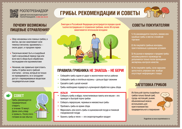 -продажа грибов разрешается на рынке в специально отведенном месте. Рассредоточенная торговля грибами в различных местах рынка не допускается. Не рекомендуется покупать свежие или сушёные грибы в местах стихийной торговли или покупать грибные консервы в банках с закатанными крышками, приготовленные в домашних условиях;