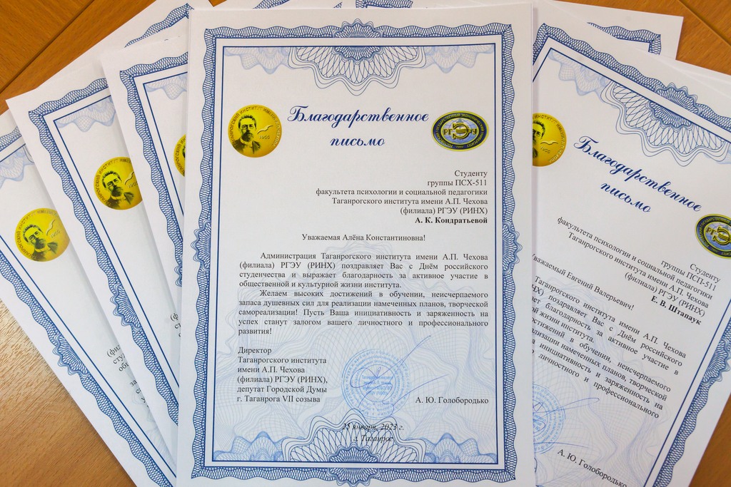 25 января 2023 года в рамках празднования Дня российского студенчества (Татьяниного Дня) в Таганрогском институте имени А.П. Чехова (филиале) РГЭУ (РИНХ) состоялась встреча администрации Таганрогского института имени А.П. Чехова и депутатского корпуса Городской Думы города Таганрога с лучшими студентами-первокурсниками, преподавателями, сотрудниками Татьянами института.