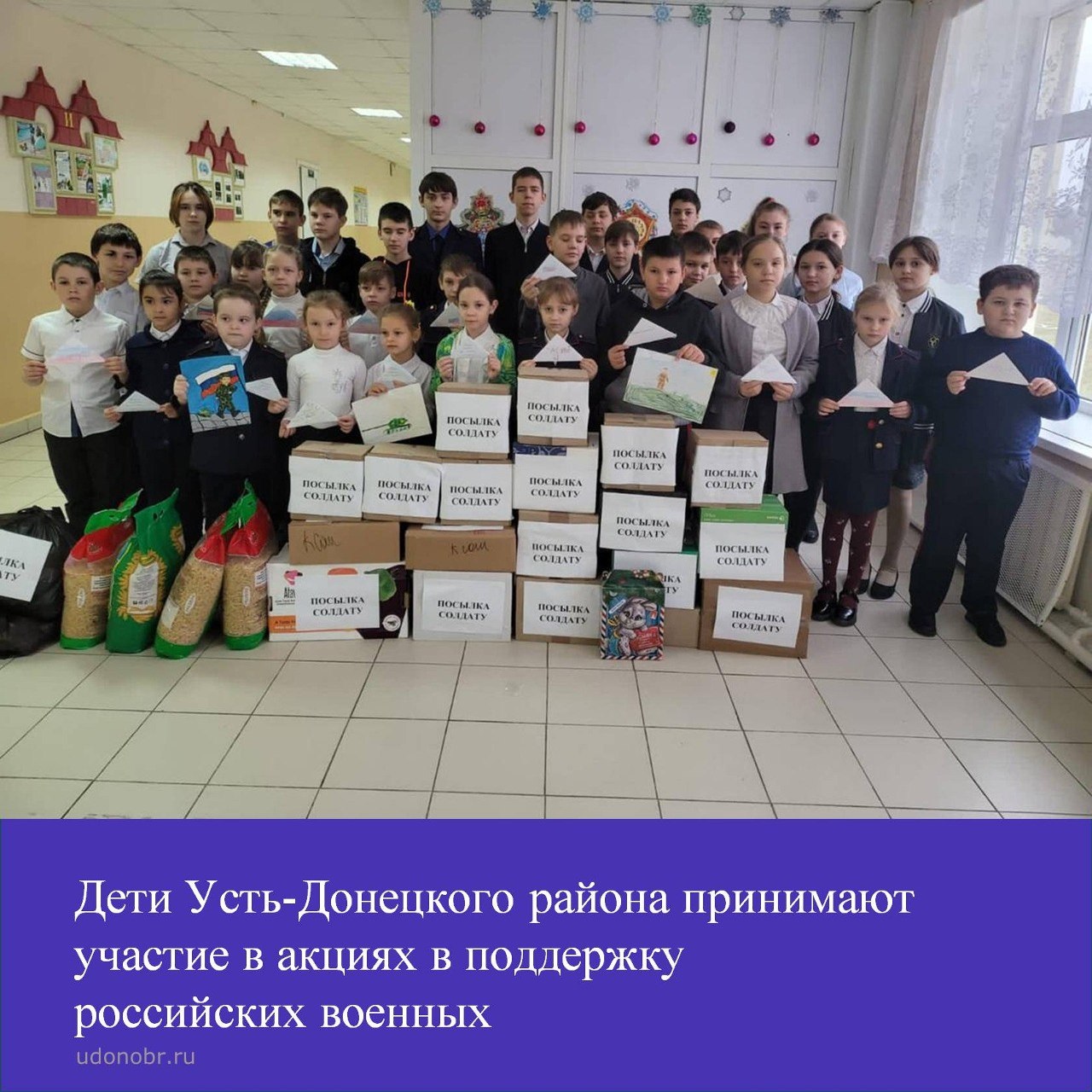 В школах и детских садах Усть-Донецкого района детки вместе со своими родителями активно собирают посылки и передают их волонтёрам, которые отправляют нашим ребятам в зону специальной военной операции. Также продолжают проходить акции в поддержку российских военных: