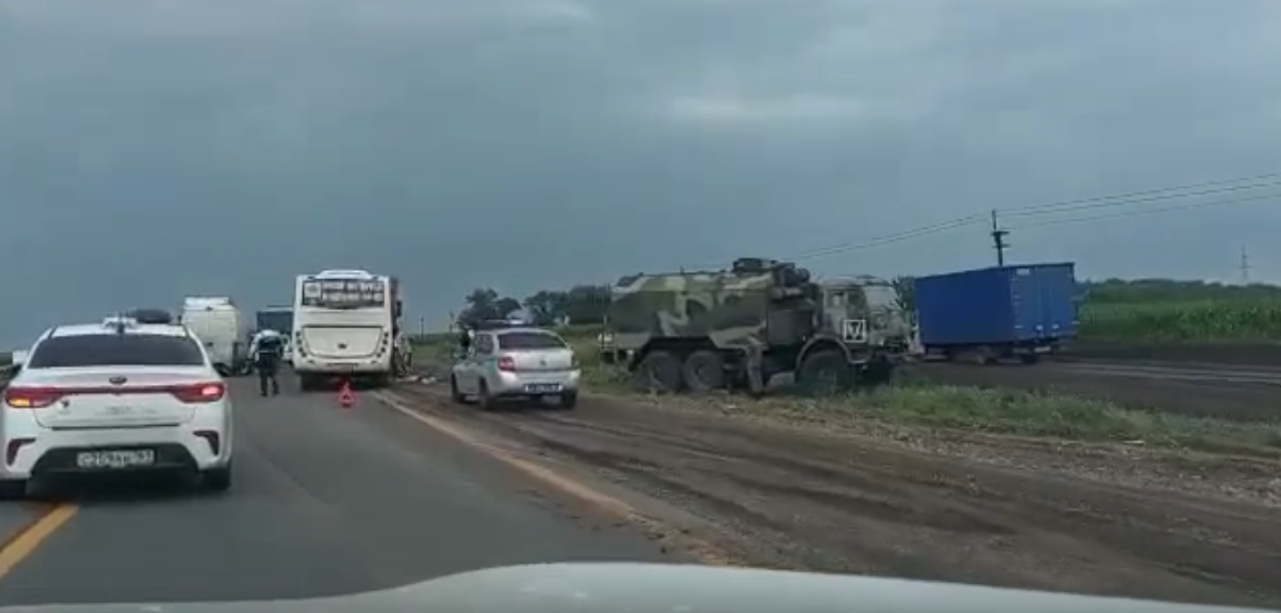 В Неклиновском районе Ростовской области образовалась огромная пробка из-за ДТП с военной машиной и автобусом.