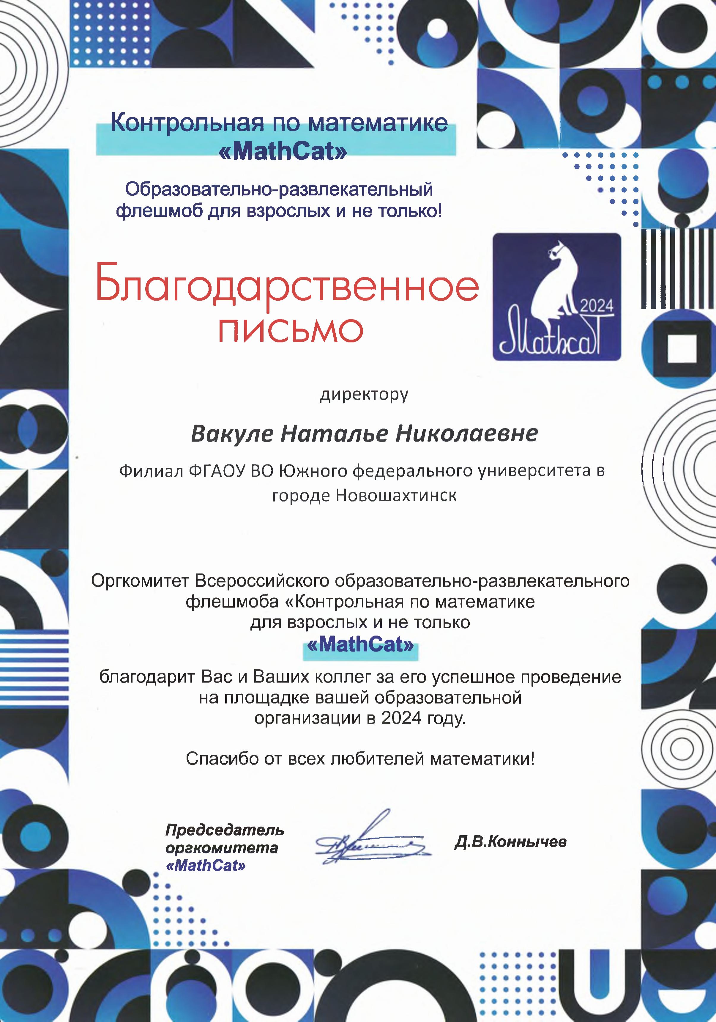 На имя коллектива филиала ЮФУ в г.Новошахтинске от председателя организационного комитета Всероссийского образовательно-развлекательного флешмоба «MathCat» Д.В. Коннычева поступило Благодарственное письмо: «Оргкомитет Всероссийского образовательно-развлекательного флешмоба «Контрольная по математике» «MathCat» благодарит вас за успешное проведение на площадке вашей образовательной организации в 2024 году флешмоба по математике. Спасибо от всех любителей математики!».