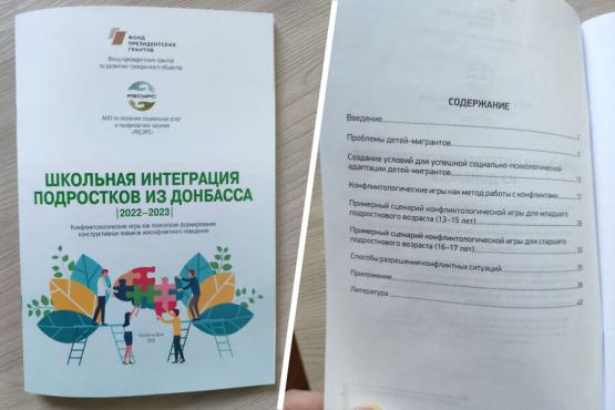 Брошюра, фотографию которой приводит источник, была издана АНО по оказанию социальных услуг и профилактики насилия “Ресурс» под эгидой Фонда президентских программ. Она предназначена для педагогов и психологов и рассчитана на 2022-2023 годы.
