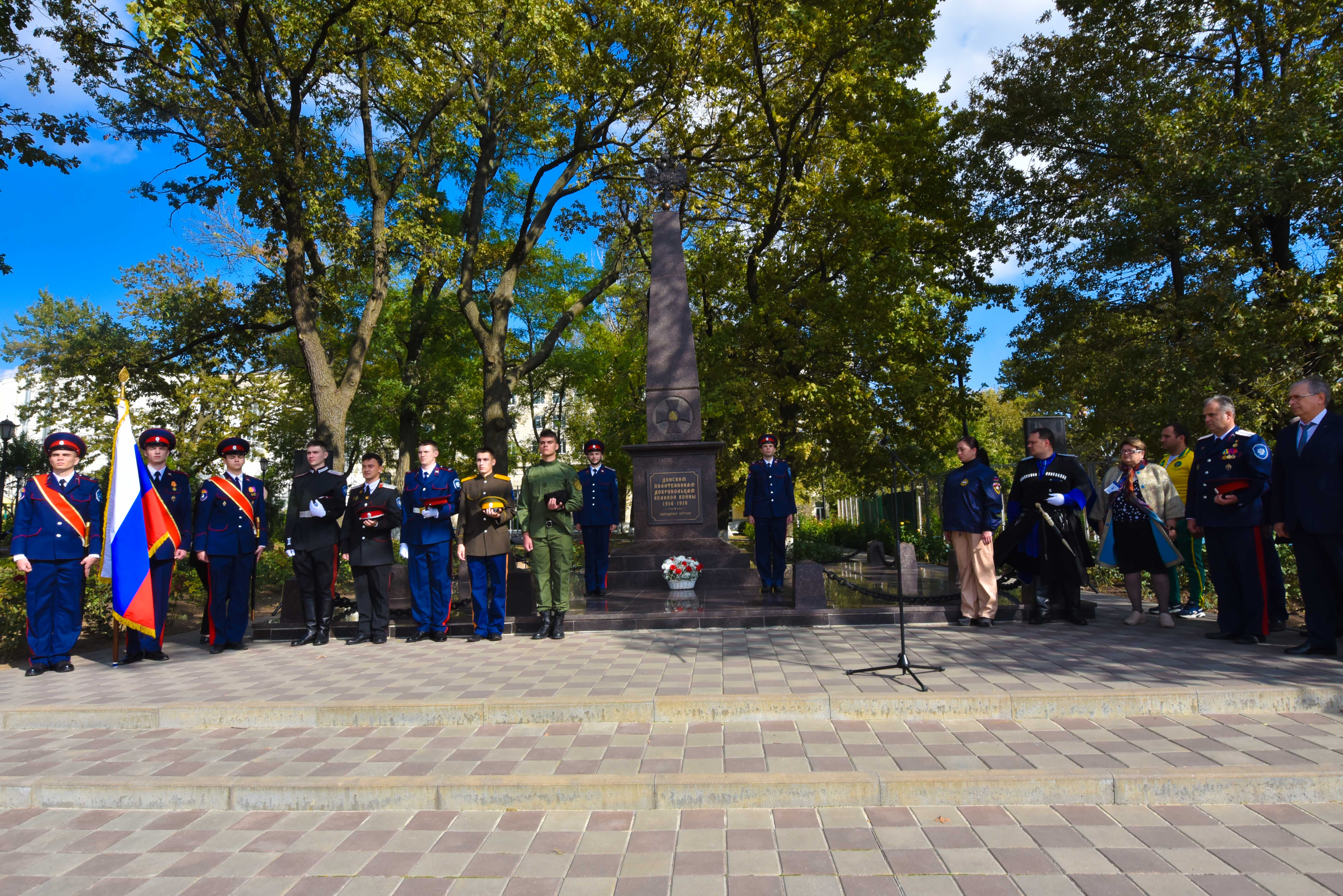 Ближе к обеду студенты из казачьих сотен собрались на территории университетского городка, где у подножия памятника донским политехникам - героям Великой войны прошёл митинг.