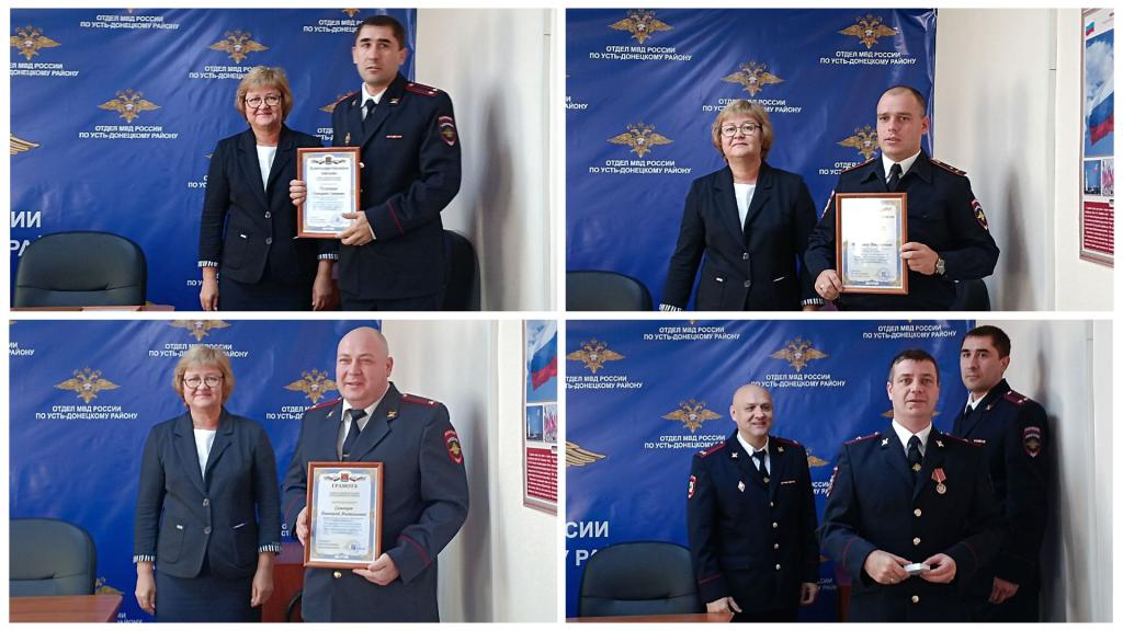 По поручению главы Администрации района Виктора Гуснай, коллектив Усть-Донецкого отдела МВД поздравила первый заместитель главы Администрации Ирина Глухарева. Она вручила Благодарственные письма главы Администрации района Дмитрию Самакаеву, Александру Плужникову и Владимиру Харченко за личный вклад в обеспечение общественного порядка и безопасности на территории Усть-Донецкого района и в связи с профессиональным праздником