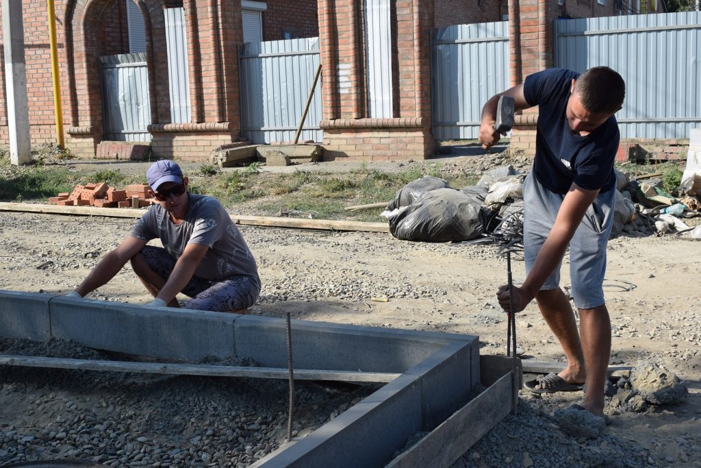 Большая часть оставшихся строительных работ — укладка тротуарной плитки. «Устанавливаем поребрики, ограничивающие дорожку. Потом будем устраивать «подушку» из песка и щебня, на которую укладывается плитка», — рассказывает рабочий Дмитрий Плетнёв.