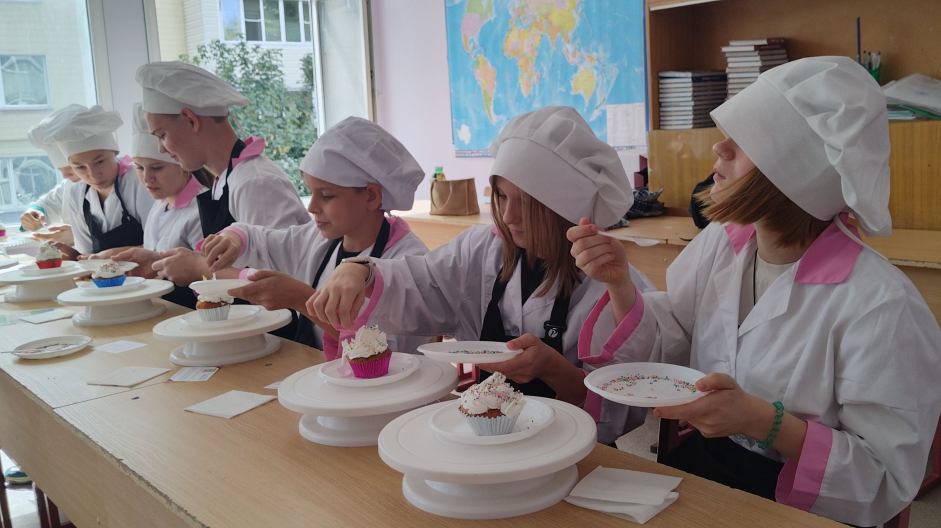 А вот Оксана Николаевна Новолодская с Инной Ивановной Кучеренко и четверокурсниками Михаилом Герасименко и Викторией Дрога представляют свою профессию: они – кондитеры. Каждый гость получает капкейк (дословный перевод с английского – «чашка торта»), точнее – его заготовку – порционный кекс, выпеченный в небольшой форме (изначально такой формой была чашка). А вот украшение из крема школьники наносят сами. Каждый становится художником. У кого-то белковый крем превращается в белый цветок, у кого-то – в белого лебедя. А потом каждый узнает, что это – не только красиво, но и очень вкусно. Наши предки тортами, пирожными лакомились только в праздники. У нас есть возможность каждый день своей жизни превращать в праздник. За это – спасибо кондитерам!