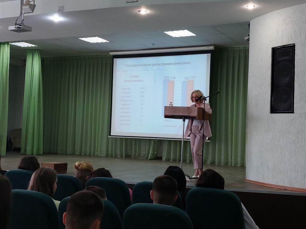Начальник отдела ЗАГС Наталья Ульченко и сотрудники познакомили старшеклассников с работой органов записи актов гражданского состояния, рассказали об истории их создания, этапах становления и деятельности в 21 веке.