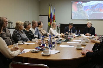 За столом собрались: Александр Лотарев, глава Администрации города Зверево; Ирина Крюкова, заместитель главы Администрации города Зверево по соцвопросам; Елена Елисеева, председатель комитета Законодательного Собрания Ростовской области по социальной политике, труду, здравоохранению и делам военнослужащих, представители учреждений социальной сферы и семьи участников СВО.