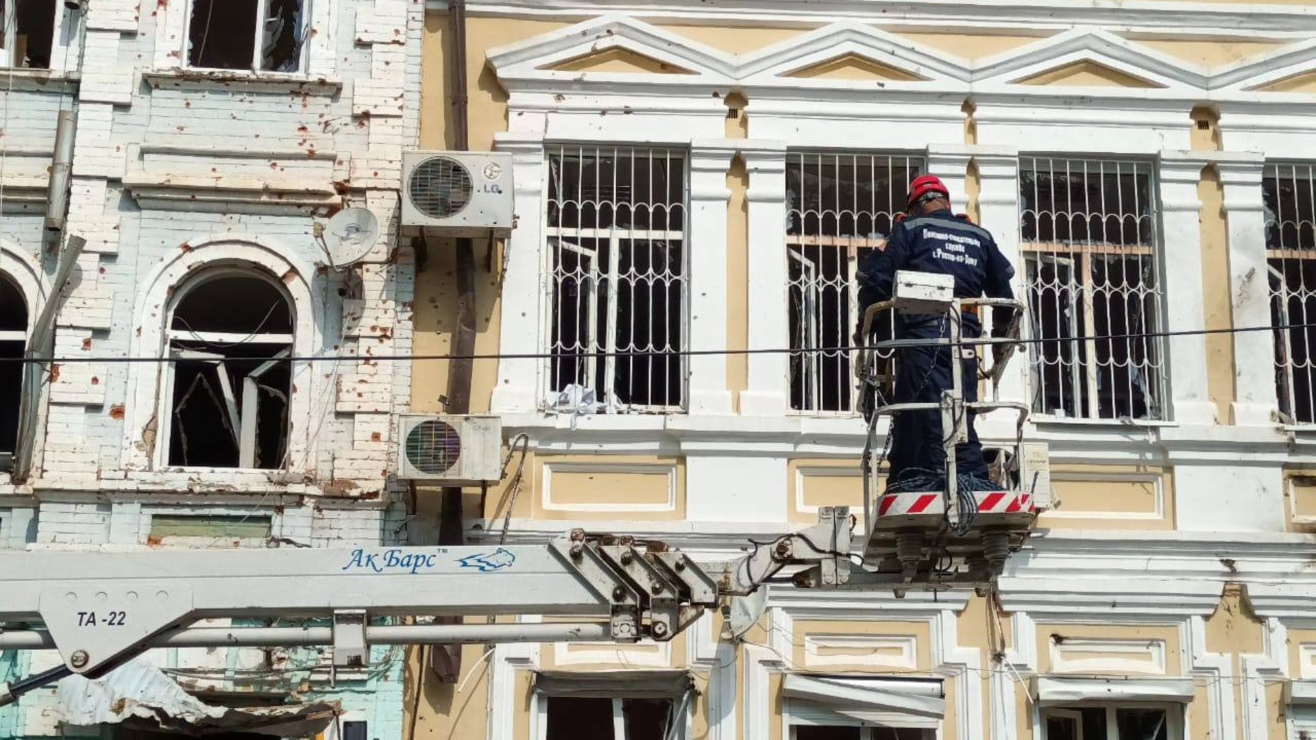 Глава администрации Алексей Логвиненко показал, как восстанавливают дома. На фото видно, что у зданий выбиты стекла и оконные рамы. Осколки значительно повредили облицовку. Погнулись металлические листы и даже телевизионные антенны.