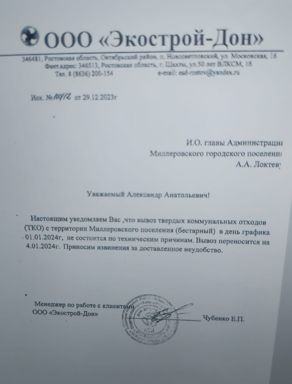 Согласно уведомлению, направленному ООО «Экострой-Дон» на имя и.о. главы администрации А.А. Локтева, в день графика 01.01.24 г. вывоз ТКО не состоится и переносится на 04.01.24 г. по техническим причинам. При этом последняя дата, когда компанией осуществлялся вывоз ТКО на территории Миллеровского городского поселения – 28.12.24 г. В данный период времени прогнозируется температуре воздуха свыше + 5 градусов, при которой вывоз ТКО, согласно СанПиН, должен осуществляться ежедневно. Администрацией Миллеровского городского поселения ведется претензионная работа по факту недобросовестного выполнения контрактных обязательств ООО «Экострой-Дон». Информационные письма направлены в адрес Министра ЖКХ Ростовской области и главе администрации Миллеровского района.