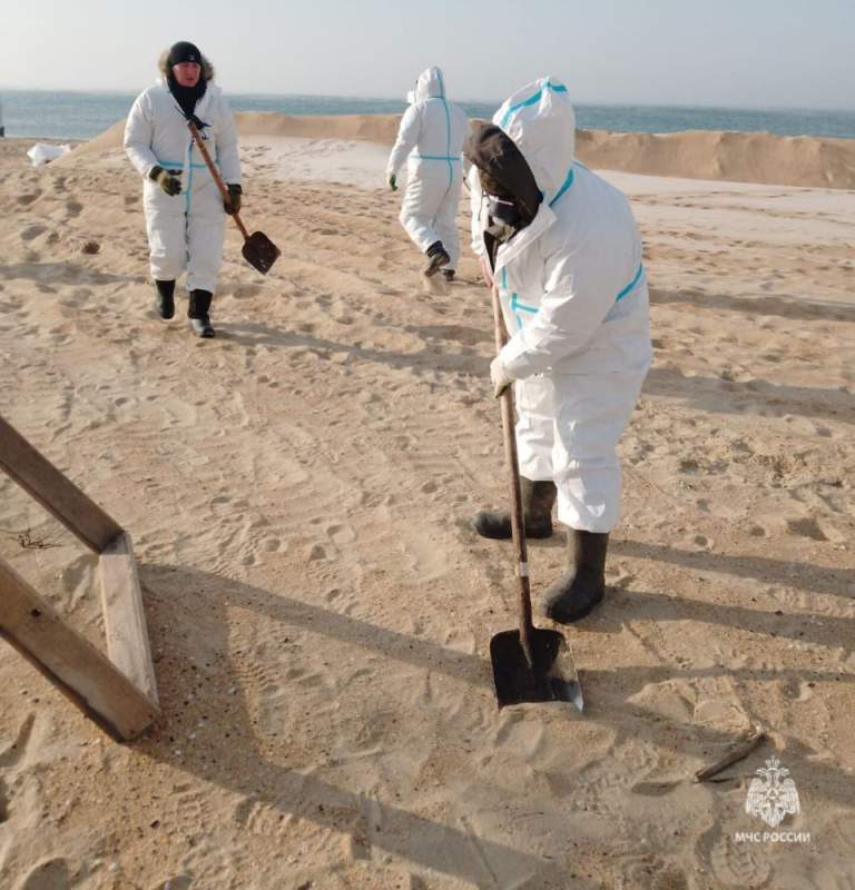 Накануне пресс-служба ведомства сообщила, что в зоне чрезвычайной ситуации на черноморском побережье работают 103 специалиста и 17 единиц техники из аэромобильной группировки Донского спасательного центра и Главного управления МЧС России по Ростовской области. Они очищают песок от мазута и спасают животных.