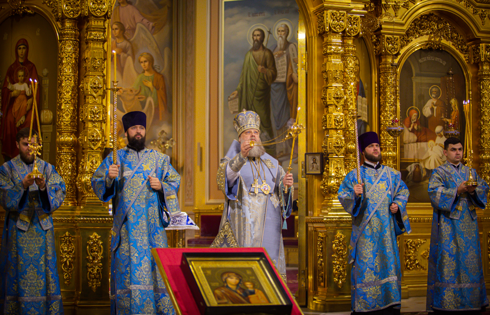 Его Высокопреосвященству сослужили епископ Таганрогский Артемий, настоятель собора иерей Леонтий Дмитриев, духовник епархии протоирей Николай Урывский, клирики храма.