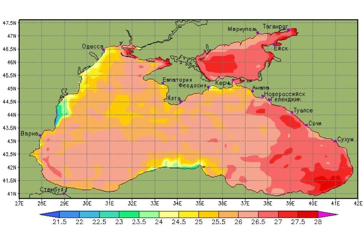 При этом температура воды на пляжах нашего Таганрогского залива составляет 27-29 градусов и даже выше, от Геленджика и южнее - тоже 27-29 градусов.