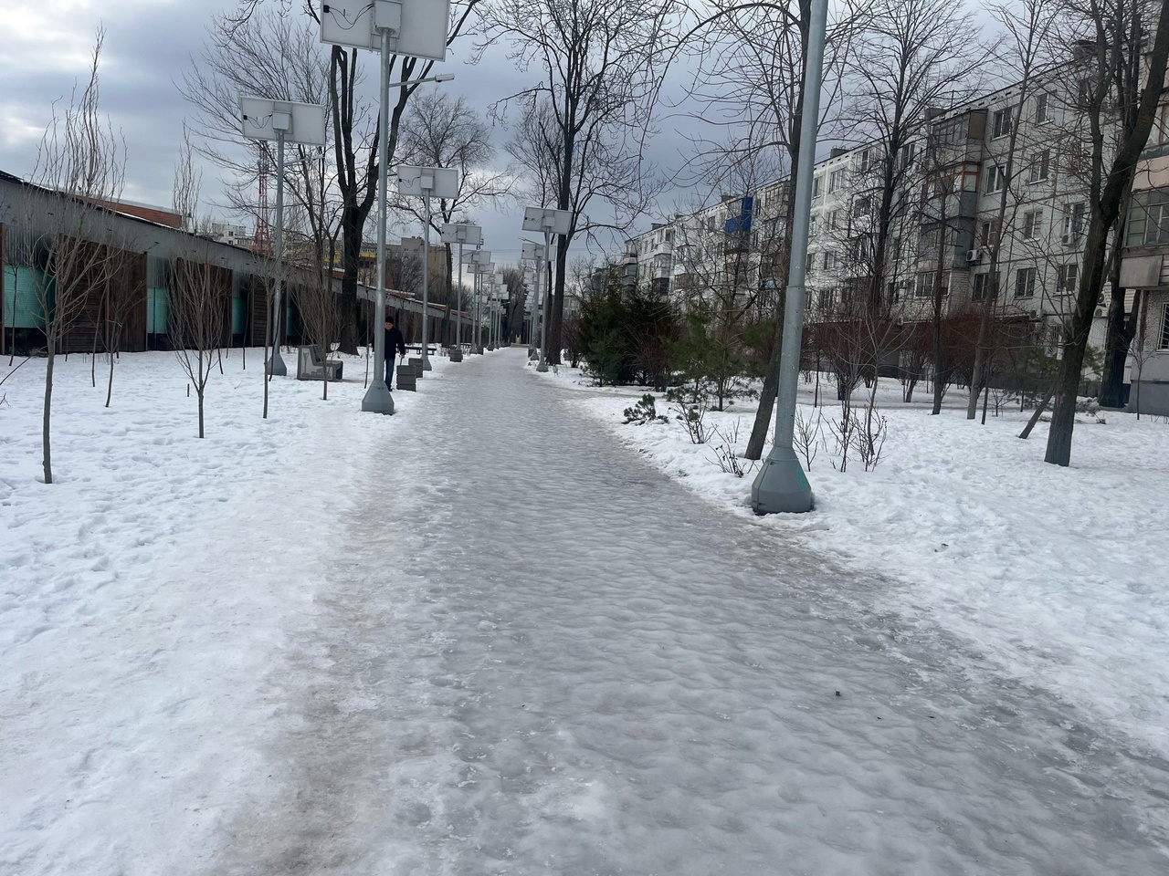 Несмотря на то что уже прошло довольно много времени после снегопадов, значительная часть внутридворовых проездов и тротуаров по-прежему остаётся под слоем льда.