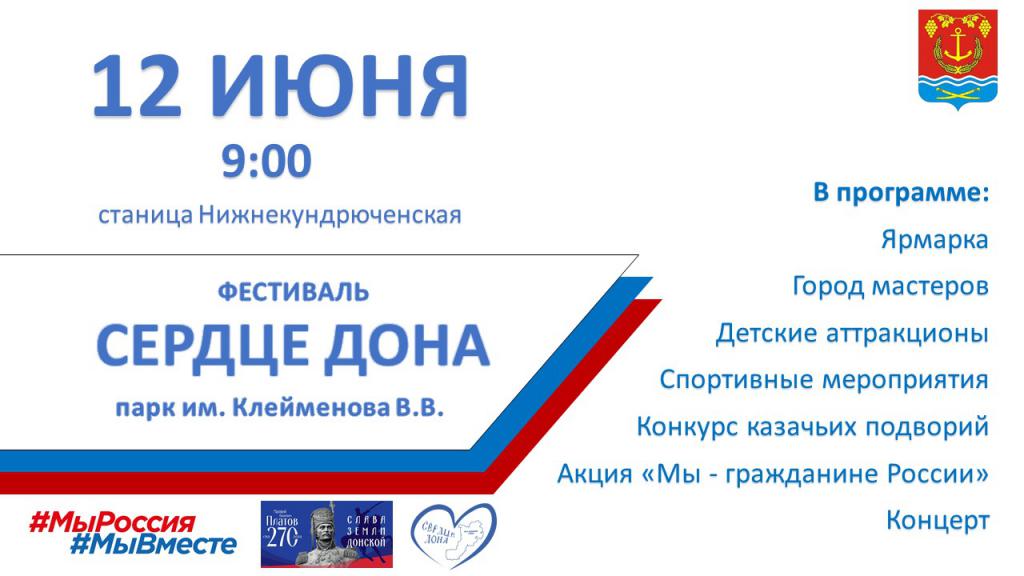 Принято решение, что традиционно он пройдет на территории парка в станице Нижнекундрюченской, гостей ждет ярмарка продуктов местного производства, спортивные соревнования, развлекательная программа и аттракционы для детей, выставка и продажа изделий прикладного искусства «Город мастеров». Завершится фестиваль награждением победителей конкурсов, торжественным вручением паспортов юным устьдончанам и праздничным концертом.