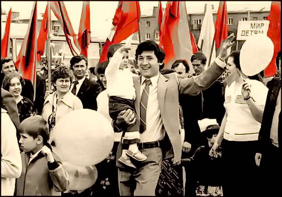 В колонне передовиков идут атоммащевцы А.С. Атаманов, Г.Ф. Емельяненко, воэзовцы Н.Н. Ревенко, А.М. Деев. Здесь же учителя, работники химзавода имени 50-летия ВЛКСМ, лесоперевалочного комбината, службы быта и торговли, транспорта и медицинского обслуживания.