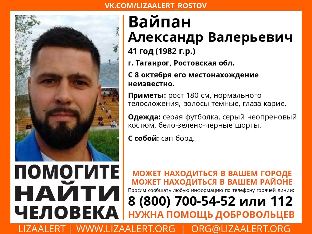 Пропал 41-летний таганрожец Александр Вайпан, о местонахождении которого ничего не известно с 8 октября, сообщает поисковый отряд «ЛизаАлерт».