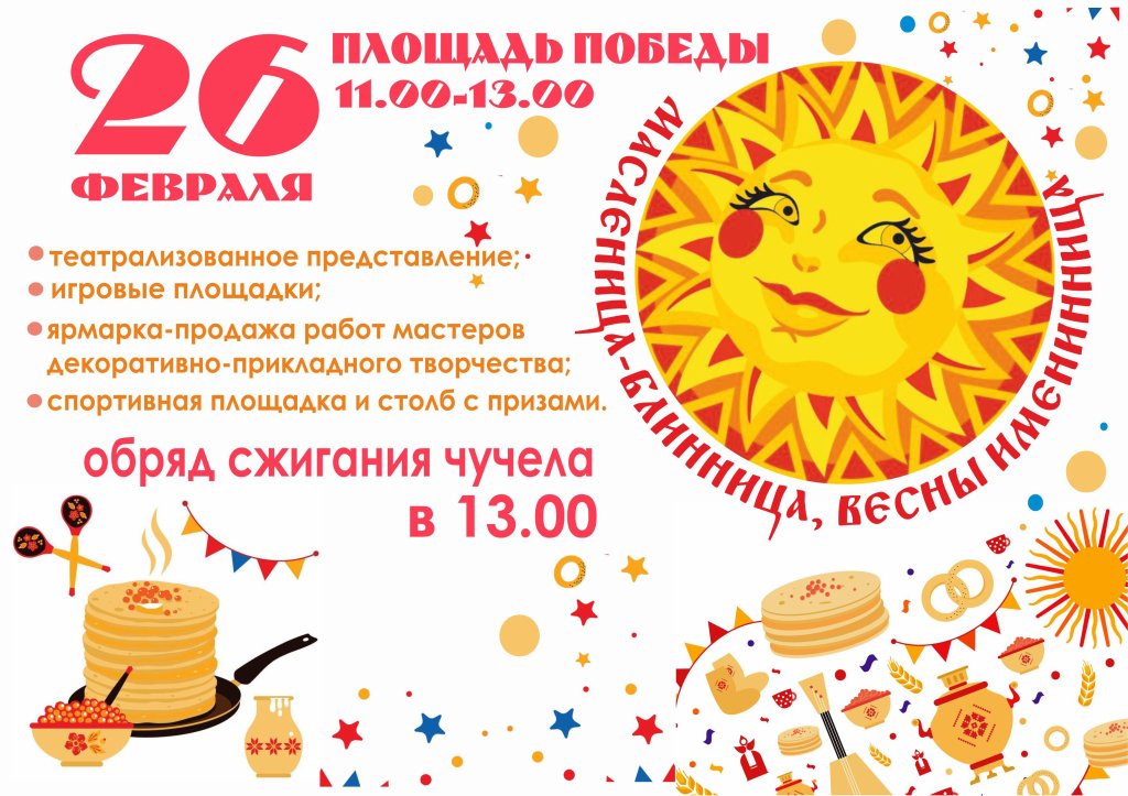 Жителей и гостей города ждет праздничная программа: театрализованное представление на открытой сцене возле ДК «Октябрь», фотозоны, ярмарка, столб с призами, игровые и спортивные площадки. Сжигание чучела Масленицы — в 13.00.